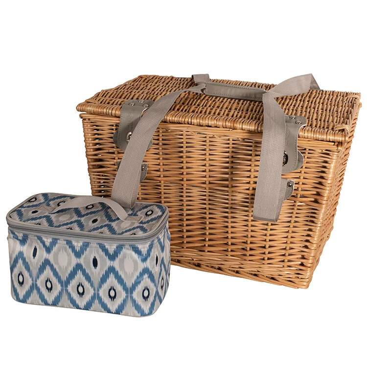 The Avanti 4-Person Picnic Basket is a classic wicker picnic basket with an Ikat pattern lining with a lift out in insulated cooler, 2x toggle closure, and webbing straps.
