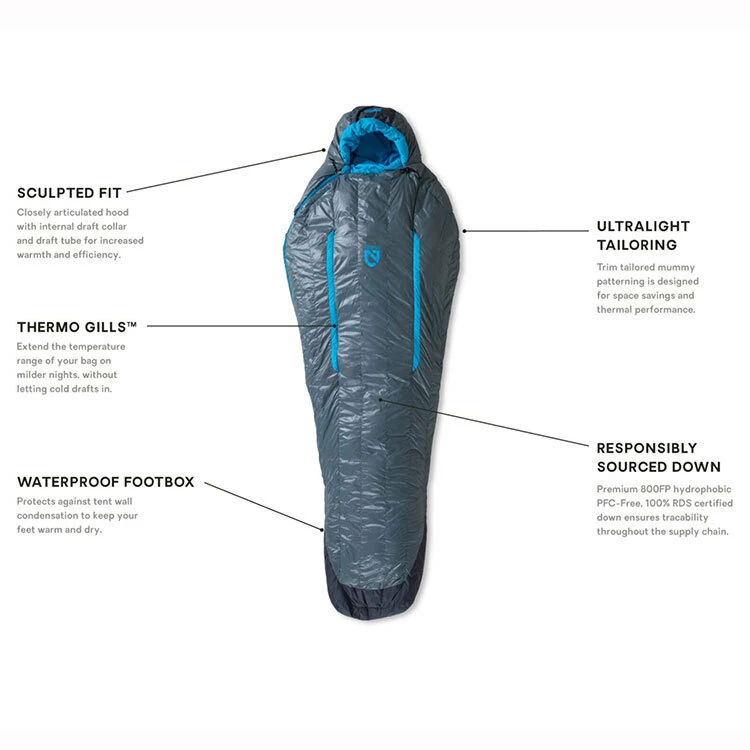 Nemo’s flagship Thermo Gills™ allow you to regulate temperature without letting in drafts, deeply extending the useable temperature range. The waterproof/breathable footbox and hood protect from tent wall condensation. Our exceptionally packable 800 FP down is hydrophobic, PFC-free, and 100% Responsible Down Standard (RDS) certified. Top shelf fabrics include a 20D nylon ripstop with DWR on the shell, an ultra-smooth 30D nylon taffeta lining, and a 40D nylon ripstop OSMO™ waterproof/breathable footbox.