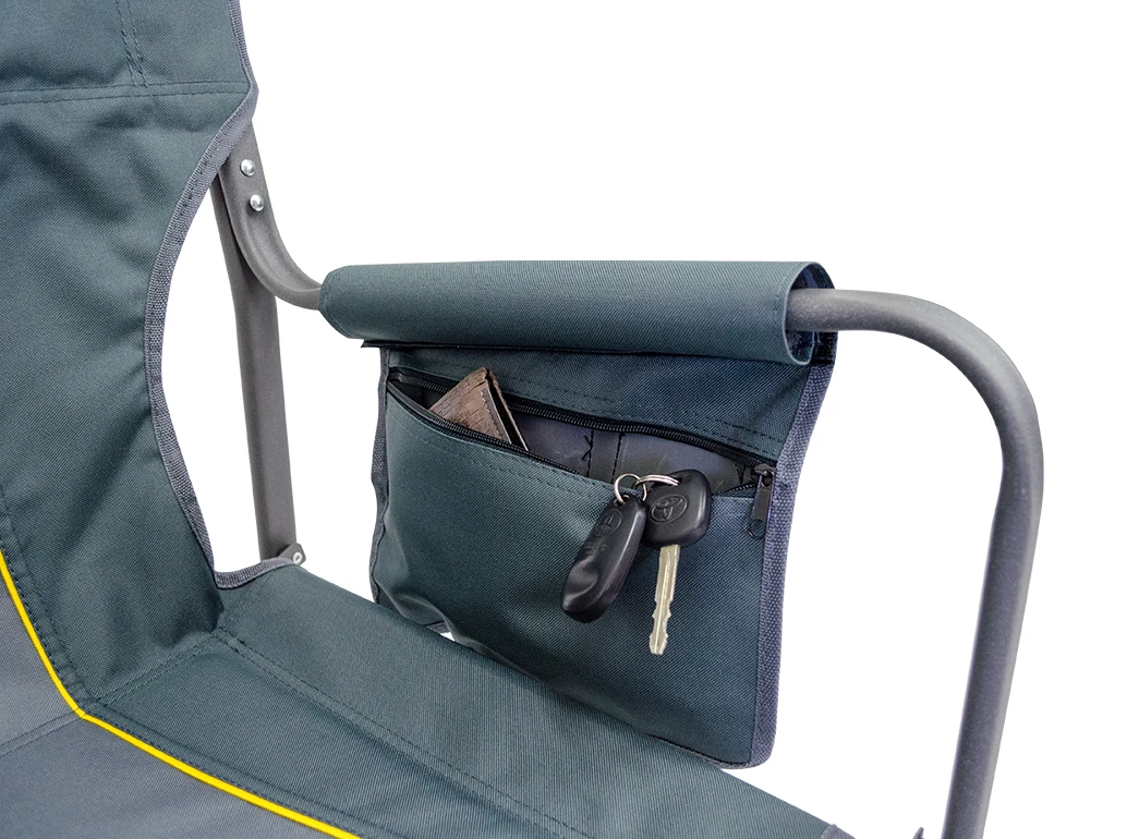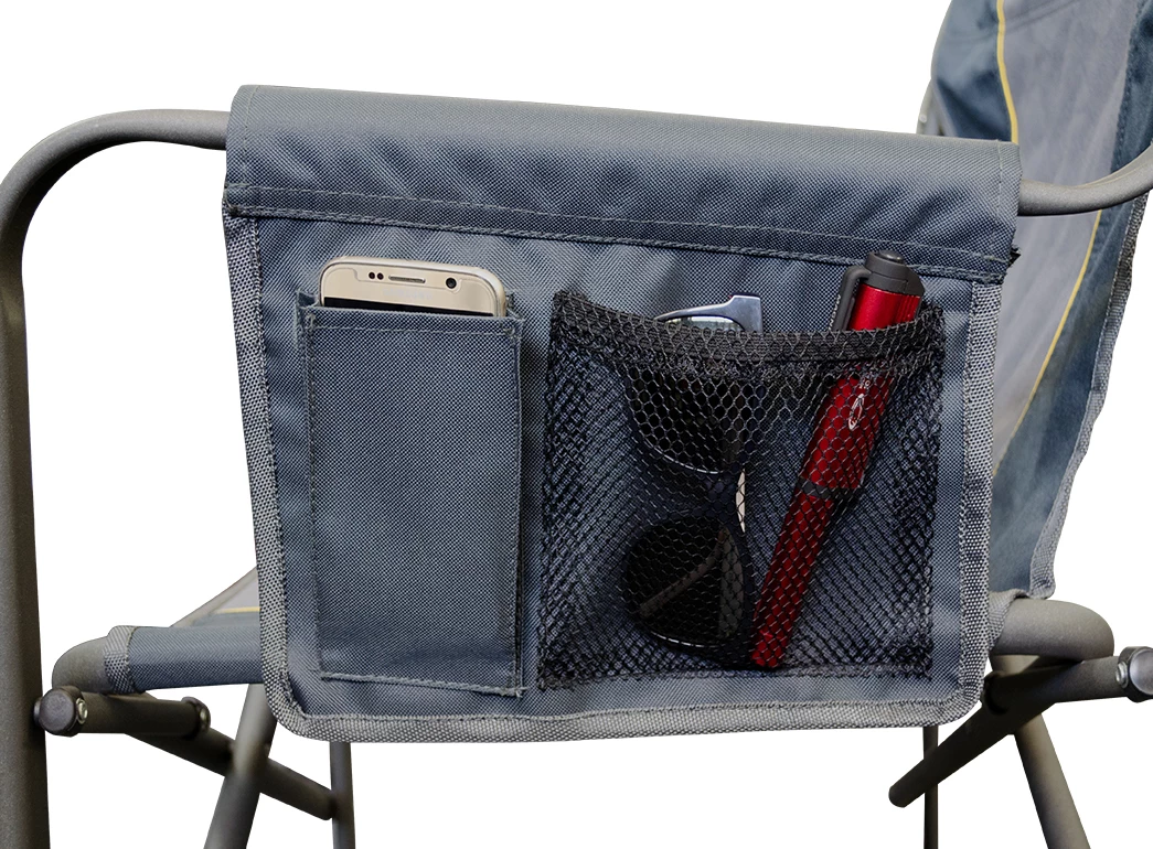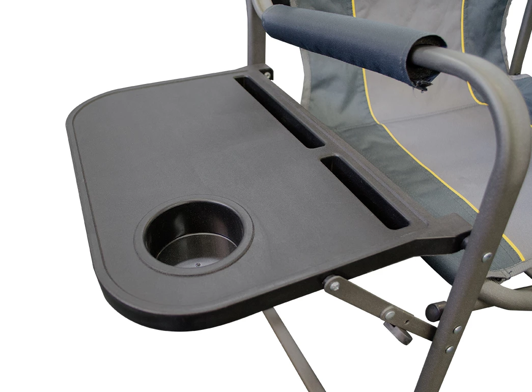 - Fold out waterproof plastic table with cup holder and slots for phone and tablet