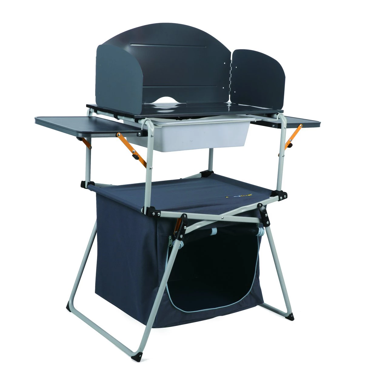 A compact folding camp kitchen with wind guard and under bench storage.