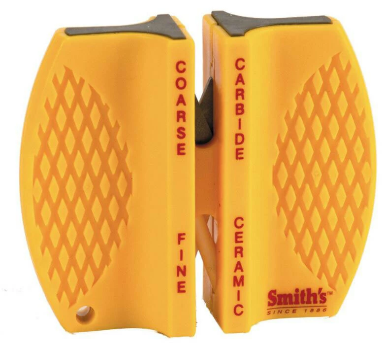 Smiths 2-Step Knife Sharpener features two tungsten carbide blades with pre-set angles to ensure the perfect edge every time. Three or four strokes through the carbide sharpening slots will restore the edge on a very dull knife. The two crossed ceramic rods also have pre-set angles and provide a smooth finished edge